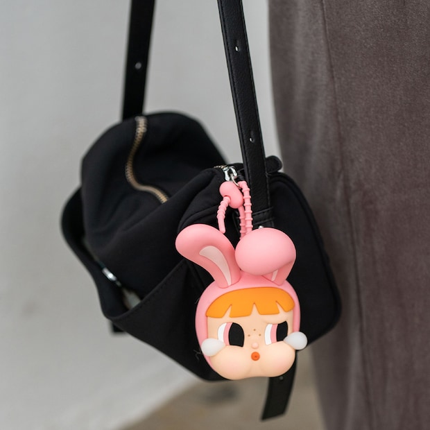 『ポップマート』のクライベイビーで遊び心をプラス。『ポイック』のレザーバッグとの組み合わせで、大人可愛いアクセントを演出!