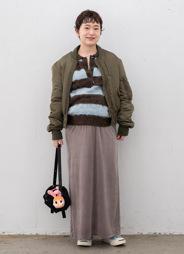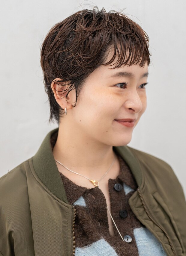 レイヤーで動きをつけたショートヘアが軽やか! 華奢なアクセサリーで洗練された印象に仕上げ、冬のMA-1スタイルをおしゃれに昇華。