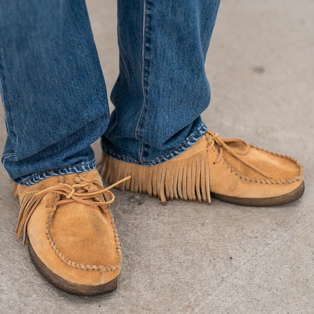『クラークス』と『アンスクリア』のコラボシューズがパパコーデのポイント。ダメージデニムと合わせてカジュアルダウンしつつ、大人の余裕を感じさせる足元に。