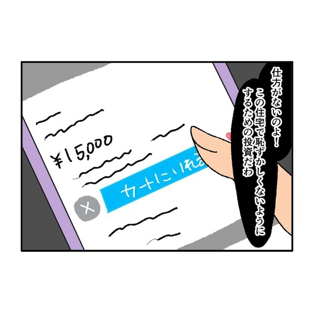 ハルミは高見さんや小山さんと親しくなるにつれて、次第に強い対抗心を持つようになりました。その結果、見栄を張りたい気持ちから、夫のコタロウに内緒でブランドバッグを買ってしまいました。