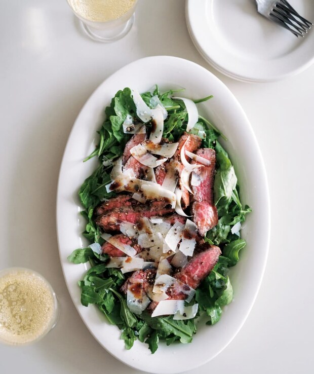 ③ 器にルッコラを広げて盛り、❷をのせる。パルミジャーノ・レッジャーノをピーラーで削りながら散らし、Aを表記順にかける。
