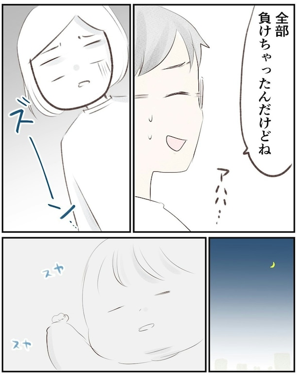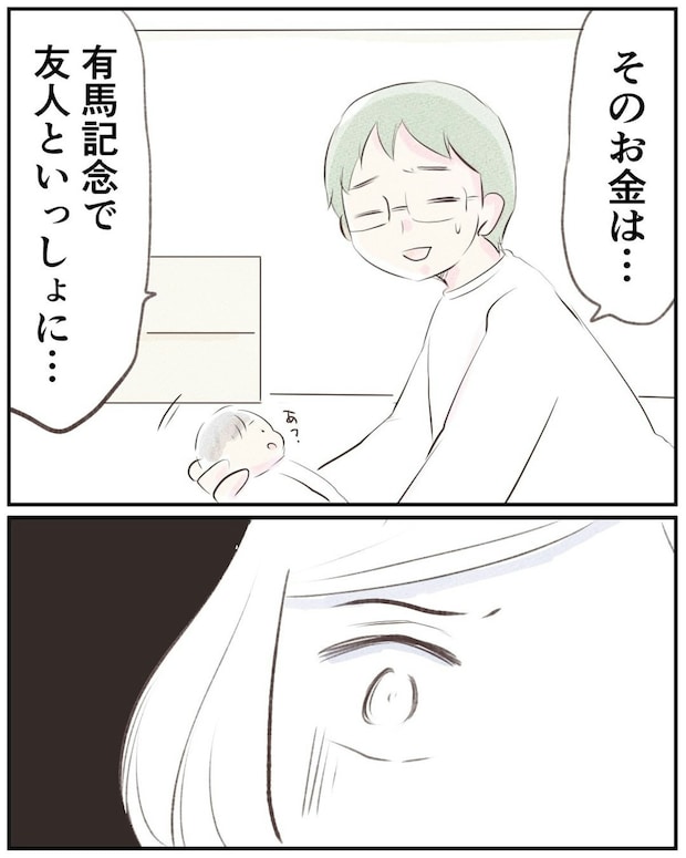 夫は、ギャンブルで借金を返済しようとしてました…。ボーナスの40万円も、まるまる競馬につぎ込まれたあと。しかも「全部負けちゃった」とへらへらしながら答える姿には、あきれてしまいます。
