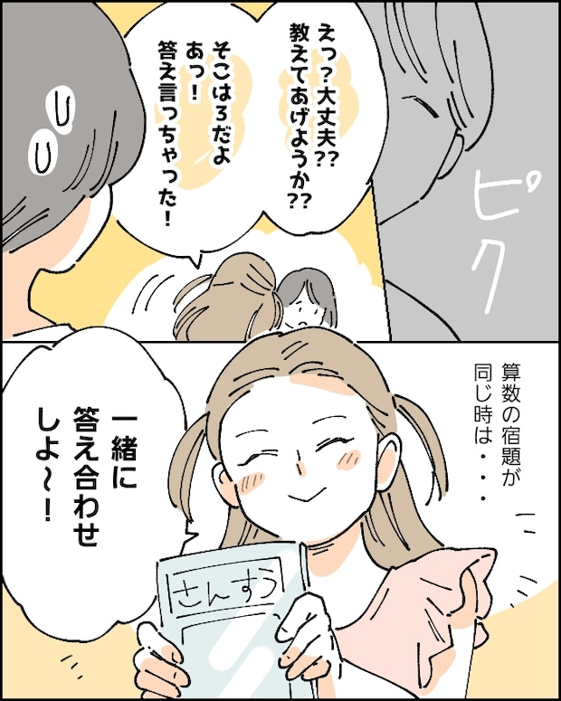 幼稚園の頃から一緒の同級生ヨウちゃん。アイちゃんのママが、ヨウちゃんのちょっぴり強引な振る舞いにモヤモヤするのも当然!アイちゃんが大人しいタイプなのをいいことに、自分の都合で答え合わせを始めたり、教えてあげると言ったりと常に上から目線のヨウちゃん、自分の娘が目の前でマウントを取られているのは、見ていて気持ちの良いものではありませんよね。