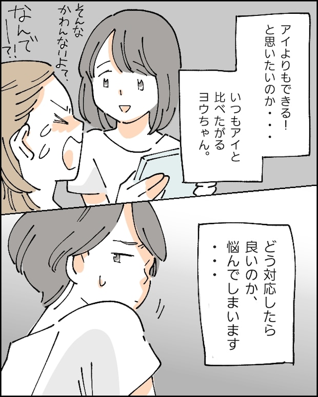 アイよりもできる!と思いたいのか・・いつもアイと比べたがるヨウちゃんに内心モヤモヤする私は、どう対応したら良いのか悩んでしまいました。