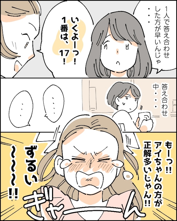 「1人で答え合わせした方が早いんじゃ・・」アイがそう言うのも聞かず、「いくよーっ!1番は、17!」と勝手に答え合わせを始めてしまいました。