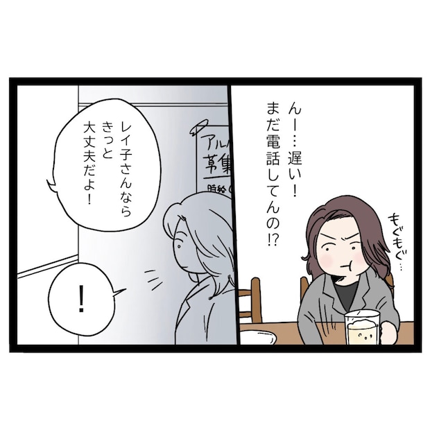 「遅い!まだ電話してんの!?」まさひでが席を離れてから十数分。一向に席に戻らないまさひでに痺れを切らした私は、様子を見に行くことにしました。すると、廊下の先から「レイ子さんならきっと大丈夫だよ!」とまさひでの声が聞こえてきました。