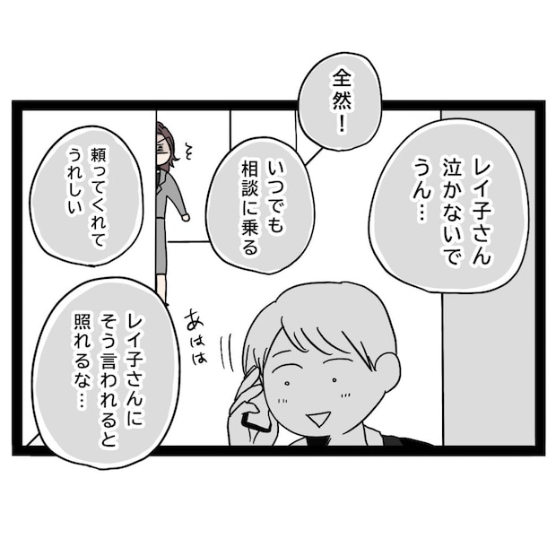 気付かれないように壁からそっと様子をうかがうと、そこには電話口の相手と楽しそうに話すまさひでの姿が。「レイ子さん泣かないで」「頼ってくれてうれしい」「レイ子さんにそう言われると照れるな」返答の雰囲気からして、どうやら誰かを励ましているようでした。