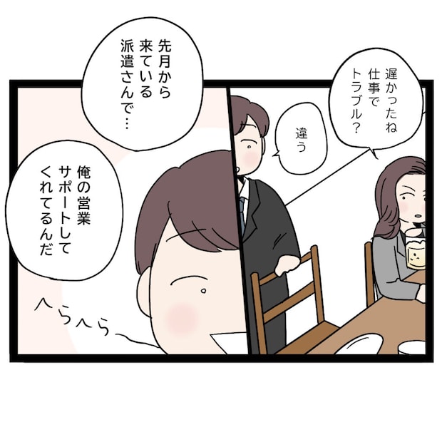 派遣さんからの電話に浮かれるまさひでに怒りを覚えましたが、ここで問い詰めてはいけない。ゆかちゃんのためにも、もう少し泳がせて浮気の真相を探らないと・・・。私は冷静を装い「へぇ~でもこの時間まで仕事なの?」とまさひでに問いかけました。