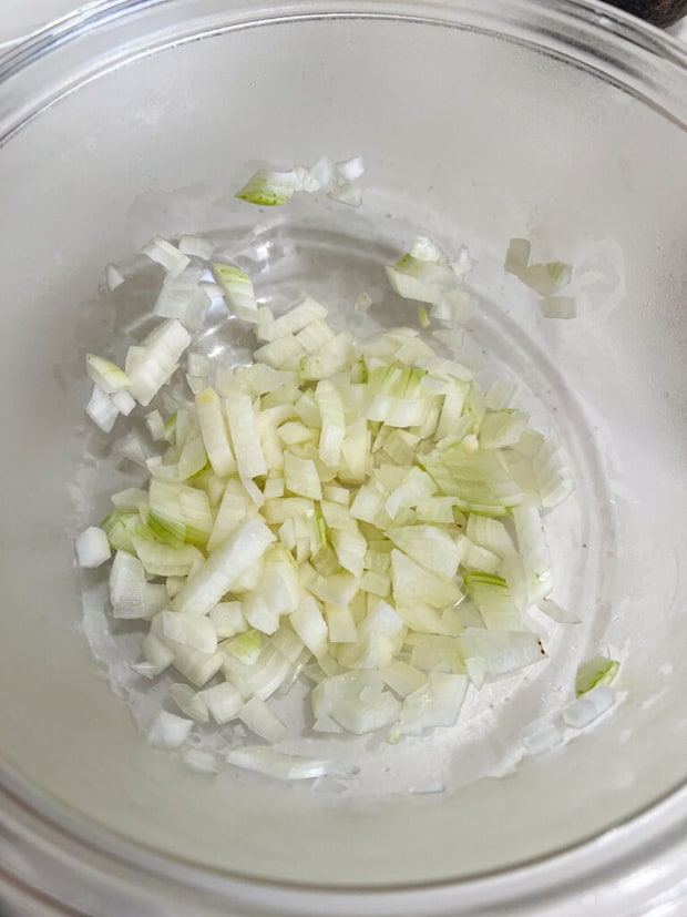 ② 茹でている間に、玉ねぎを粗みじん切りにし、レンジで40秒ほど火を通す。