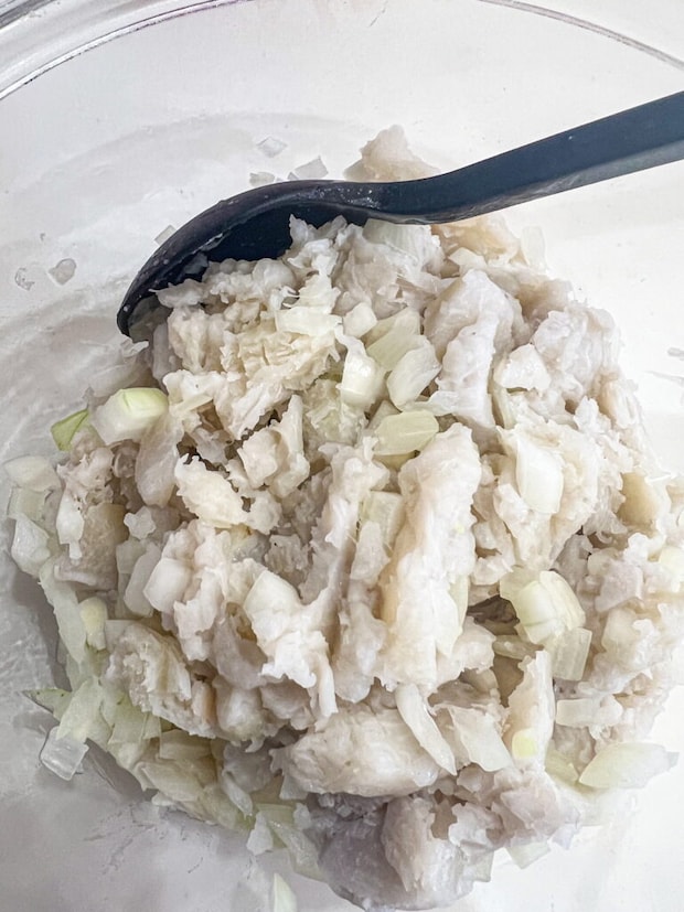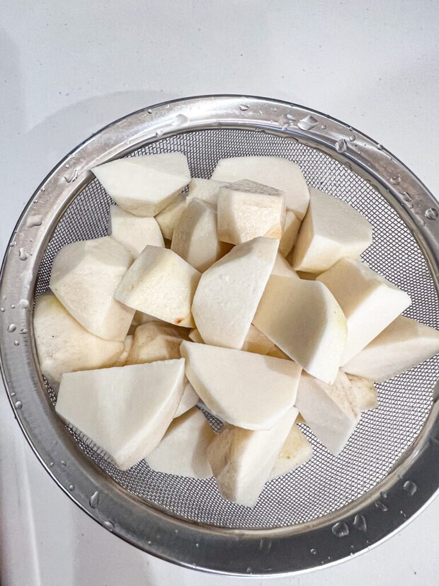 ④ 里芋が柔らかくなったらザルにあげ、水気を切り、②の玉ねぎと合わせ、粗くつぶしながら混ぜる。