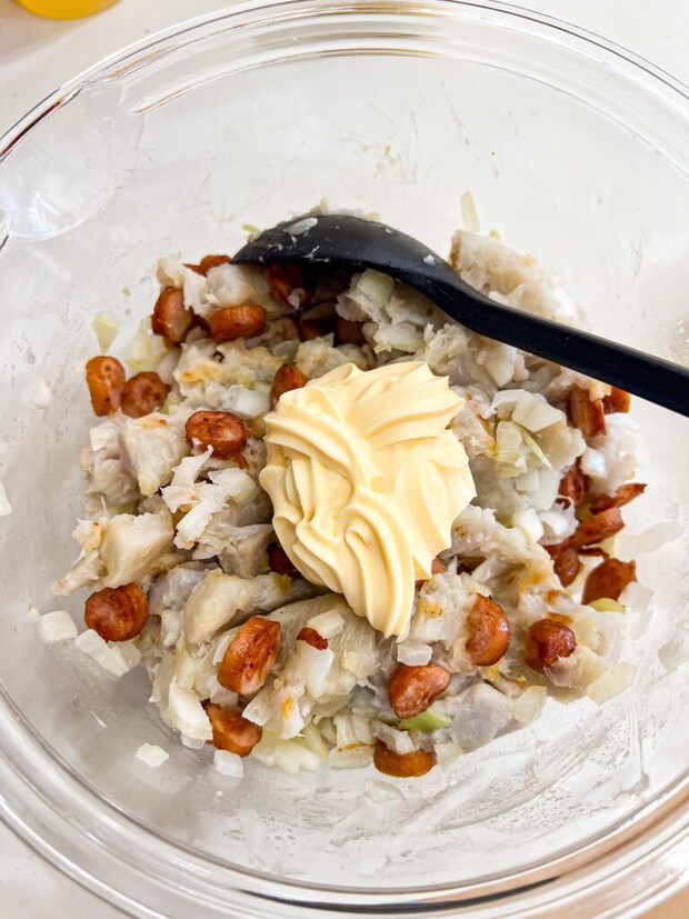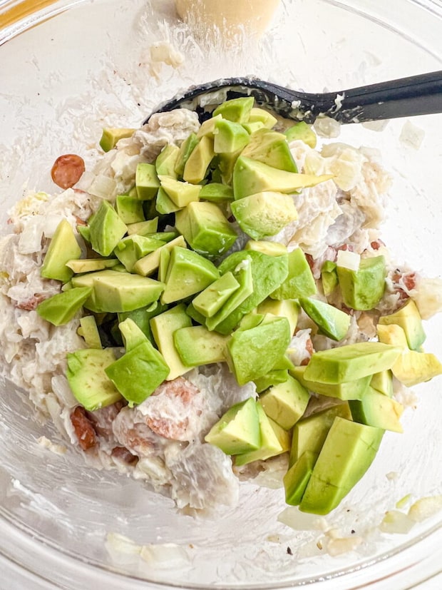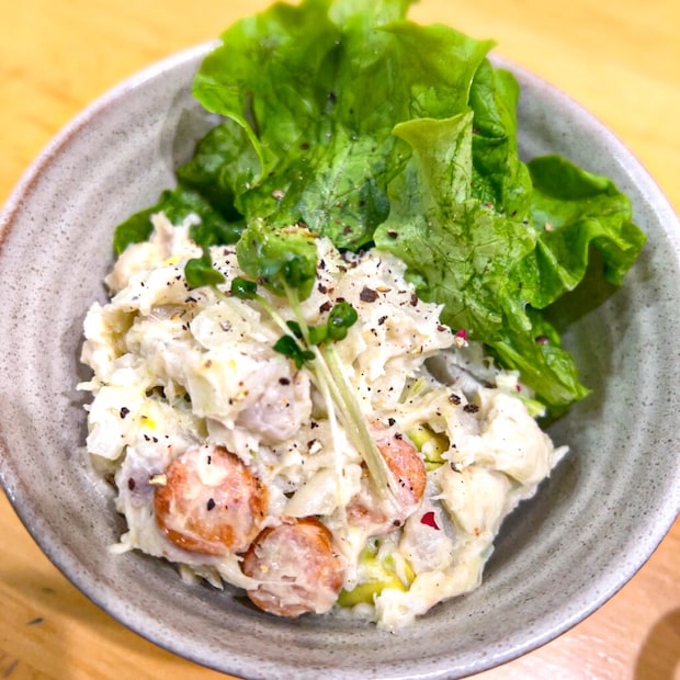 ⑥ 粗熱が取れたら、マヨネーズ・塩を入れてよく混ぜ、最後にアボカドを入れて全体を混ぜ合わせる。