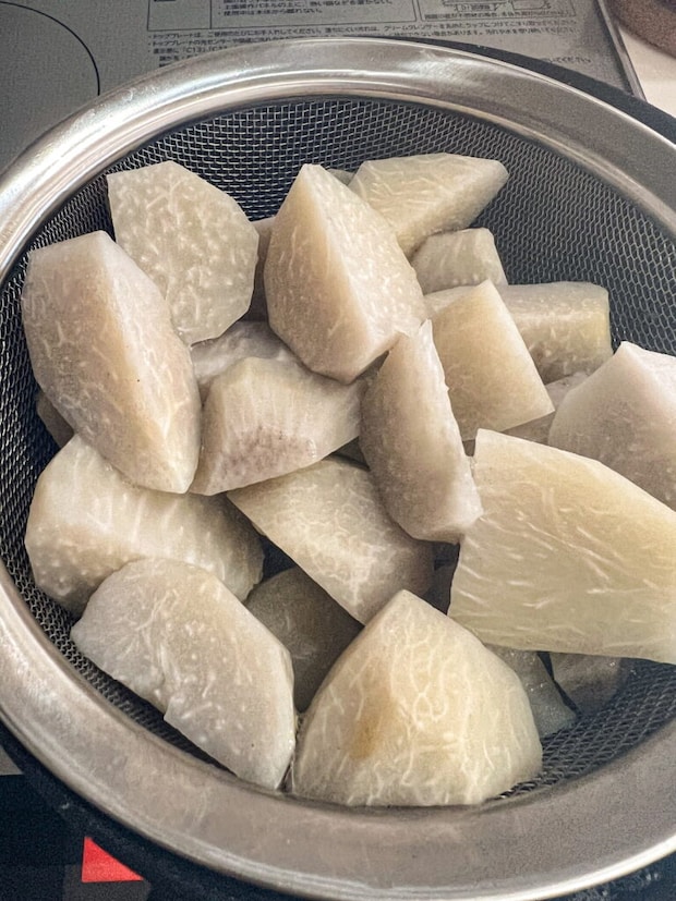① 里芋の皮をむき、適当な大きさに切って、茹でる。