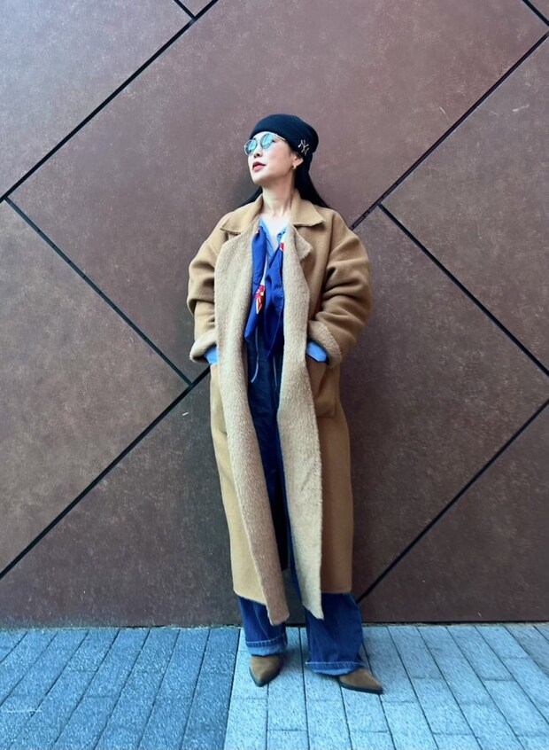 エルメスのスカーフをラフに首から垂らし、カジュアルスタイルに上品なニュアンスをプラス。ビーニースタイルが新鮮に仕上がります!