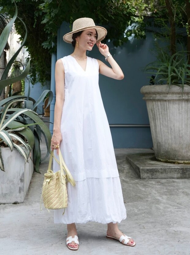 ドレススタイルのレディなムードはそのままに、ヌケのあるスタイルへと導いてくれるエルメスのサンダル「オラン」。頭文字のHがアイコニックで、デニムのようなスタイルにもしっかりハマります。