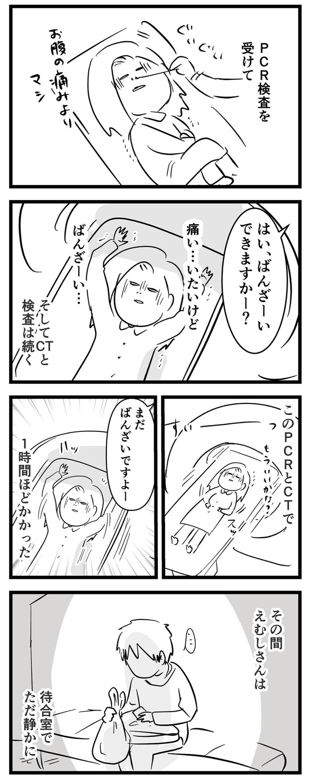 受け入れ先の病院に到着したえむふじんさんは、その後、PCR検査やCTを受け、その間夫は待合室でただ静かに連絡を待っていました。
