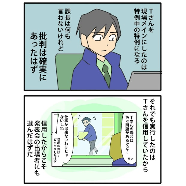 Tさんは、上司や同僚から注意を受けても、自分のやり方を貫き、周囲に混乱をもたらしました。周囲の人はトラブルに巻き込まれながらも、Tさんの長所をいかそうとしたり、名誉挽回のために場を提案したりと、柔軟に対応をしました。しかし、最終的には、そんな配慮に対しても裏切られる結果となります。