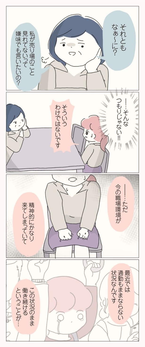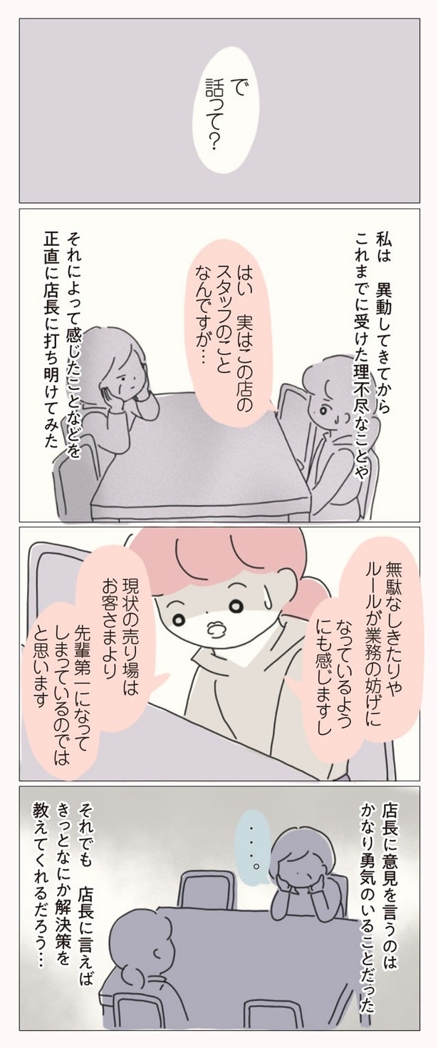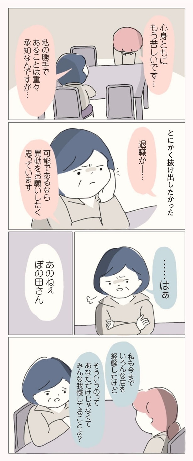子ども服ブランドでショップ店員をしているぼのこは、数ある店舗の中でも花形のB店へ異動が決まった。B店は花形と言われる一方で、昔からの派閥争いが有名。新人や異動してきたスタッフがすぐに退職してしまうという疑惑があるのだった。緊張の中、異動初日を迎えたぼのこは、早速、店長やスタッフたちから理不尽な思いを受ける。ねちねちマウンティングや悪口に陰口、過剰な先輩優先システムなど…。やがて心身ともに疲弊したぼのこは、この店舗に誰一人味方がいないことを確信。お店の悪しき風習を断ち、スタッフたちに「復讐」するため、ぼのこは店長を目指すことを決意するのだった――。