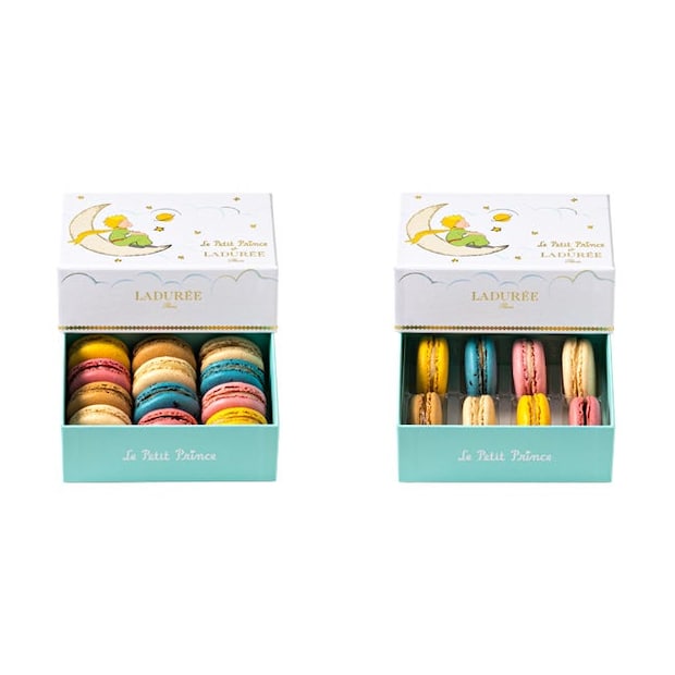 星の王子さまの限定ボックスで用意されるマカロンの詰め合わせセットも登場。オンラインブティックで発売される8個入りのマカロンボックスは、星の王子さまのプリントマカロンをはじめ、バラの花が香る「ローズ」や、ピスタチオ風味の「ピスタッシュ」、ほんのり塩を利かせたとろけるようなバターキャラメル入りの「塩キャラメル」など、色とりどりのマカロンたちが美しく並ぶ。
