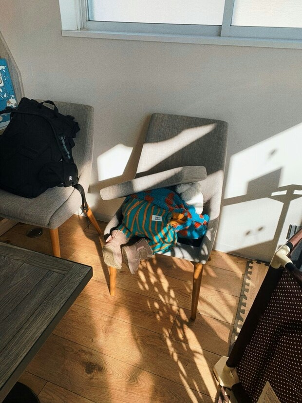 椅子のクッションを剥がし、頭だけ隠している娘さん。娘さん本人としては、しっかり隠れているつもりなのかもしれません。しかし、どう考えても収まりきれていない姿が、なんともかわいらしいショットです。