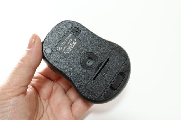 背面は電源ON/OFFスイッチ、センサー、電池挿入部、USBレシーバー挿入部で構成されています。