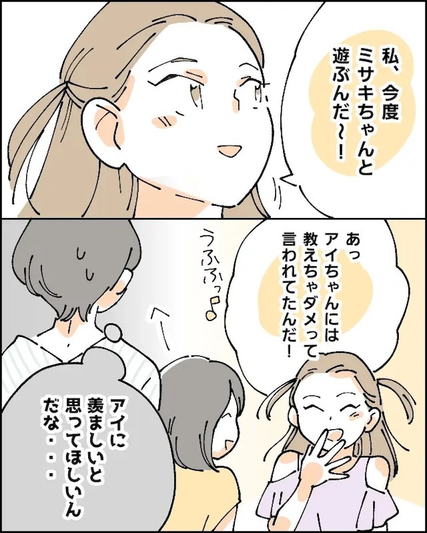 「私、今度ミサキちゃんと遊ぶんだ~!」自慢げにそう言うヨウちゃんは、「あっ、アイちゃんには教えちゃダメって言われてたんだ!うふふっ」と嬉しそうに言いましたが、肝心のアイは「へー」と何にも興味がなさそう。はたで見ていた私は「アイに羨ましいと思ってほしいんだな・・」と心の中で呟きました。