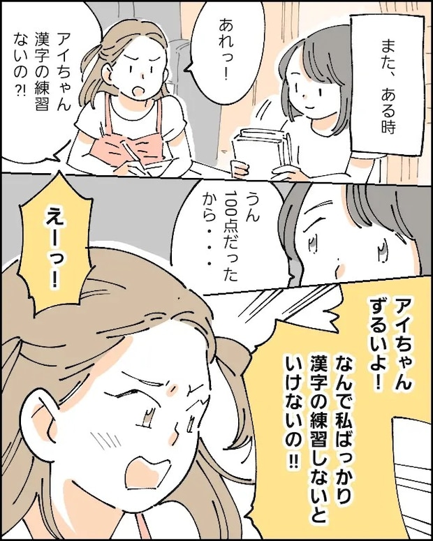 「あれっ!アイちゃん漢字の練習ないの!?」ヨウちゃんにそう聞かれ、「うん。100点だったから・・」と答えると、「えーっ!アイちゃんずるいよ!なんで私ばっかり漢字の練習しないといけないの!!」と怒り出して驚く私。
