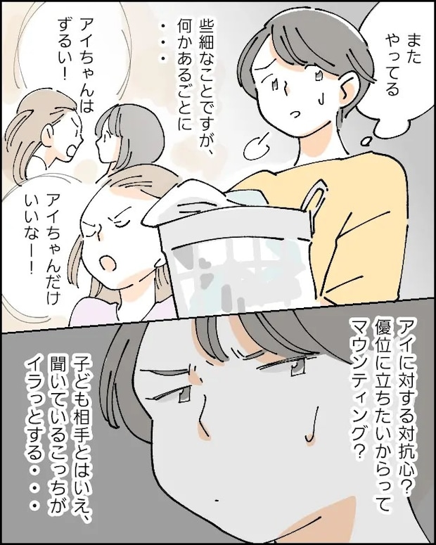 「またやってる」そう思いつつ、「アイちゃんはずるい!」「アイちゃんだけいいなー!」と些細なこととはいえ、何かあるごとにアイに対する対抗心なのか、優位に立ちたいからってマウントを取っているのか・・子ども相手とはいえ、聞いているこっちがイラっとするのでした。
