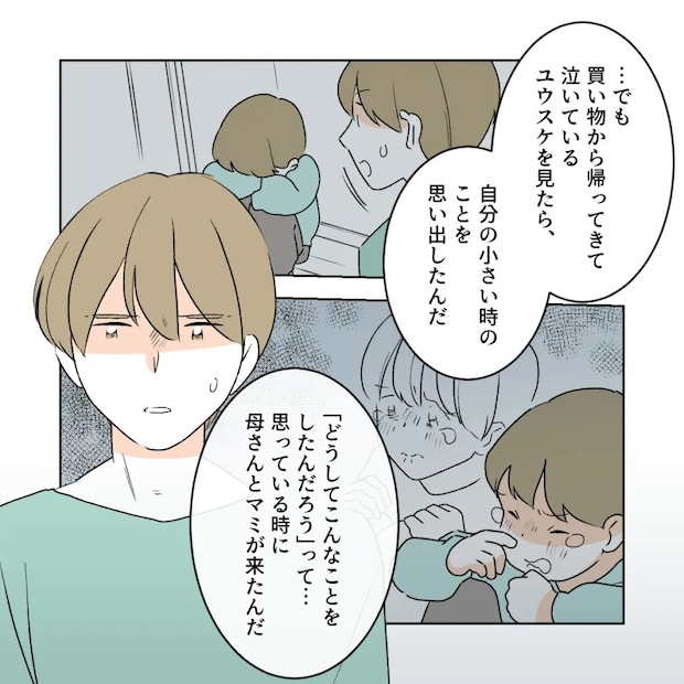 「でも、買い物から帰ってきて泣いているユウスケをみたら、自分の小さい時のことを思い出したんだ。俺も同じだったんだって。その時に母さんとマミが来たんだ」