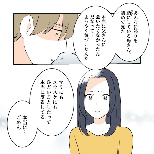 「あんなに怒りを顕にしている母さん、初めて見た。母さんは、本当に父さんに会いたくなかったんだなって・・ようやく気づいたんだ。マミにもユウスケにもひどいことしたって、本当に反省してる。本当に・・ごめん」
