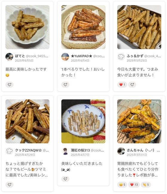 つくれぽ(つくりましたフォトレポートの略)には、「1本ぺろりでした!おいしかった!」「野菜嫌いな子供でもパクパク食べてくれました」「つまみ食いが止まりません!」などの声が届いています。