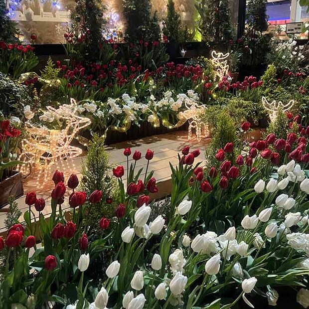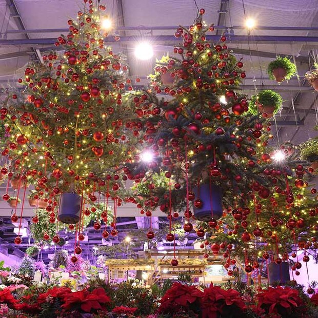また、ツリーの足元を見ると、見頃を迎えたポインセチアやシクラメンなどの花々も。頭上を彩るツリーと季節の花々が作り出す、美しい景色を堪能してみて。