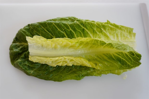 ロメインレタスは、葉と軸を互い違いに重ねます。