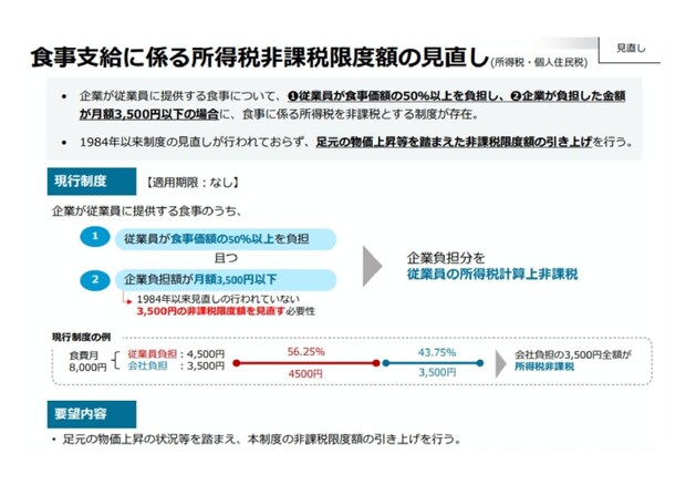 この非課税の適用を受けるには、「企業からの補助額が月額3500円以下であること」「従業員が食事代の半額以上を自己負担していること」の2点が条件となるが、この3500円という金額は1984年当時の従業員の月額食事代6,800円を根拠としており、実態と乖離している。40年以上が経過する中、食料の消費者物価指数は1984年平均に対し2025年1~7月平均で64.6ポイント上昇しており、要望では、「足元の物価上昇の状況等を踏まえ、本制度の非課税限度額の引き上げを行う」ことを求めている。