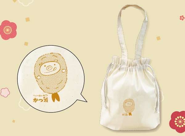 海老フライをまとったオリジナルキャラクター「勝 雅太郎(かつ まさたろう)」がワンポイントのトートバッグは、巾着として絞って使ってもOK。持ち手が長めで肩からかけられる、使いやすい仕様だ。サイズは、幅31cm×高さ35cm×マチ8cmだ。
