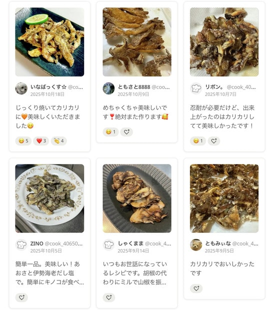 つくれぽ(つくりましたフォトレポートのこと)にも「おつまみにもなるのでまた晩酌用につくります。」「舞茸がたくさん食べられて満足!!」など、絶賛コメントがたくさん届いています。