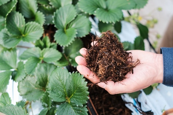 培土には、隣接する木材工場で発生するおが粉を使用。おが粉の培土は空気を含んで根が張りやすく、また生産管理が行き届くというメリットがある。加えて、従来使いきれていない森林資源を余すことなく活用できる。