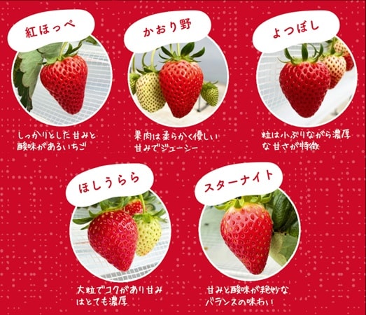 なお、店頭販売で購入できる品種、いちご狩りで食べられる品種は、その時々の育成状況により変動することがある。