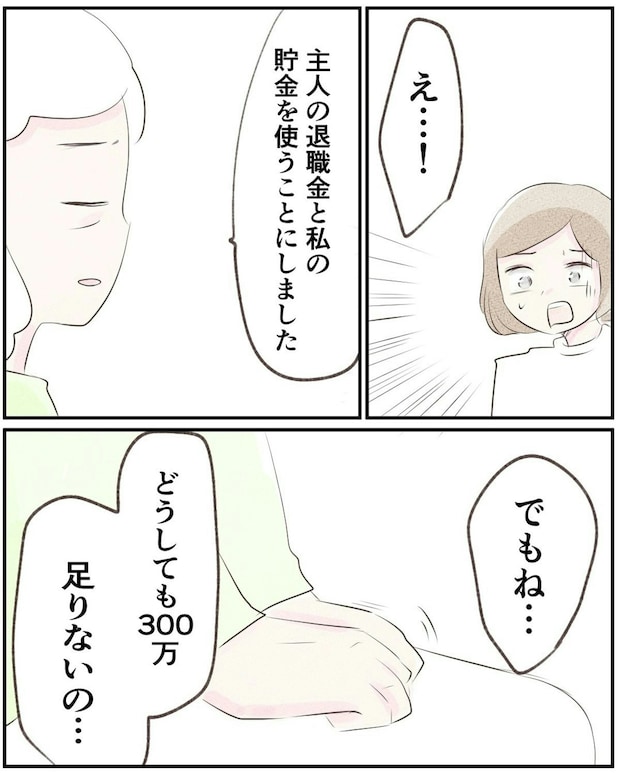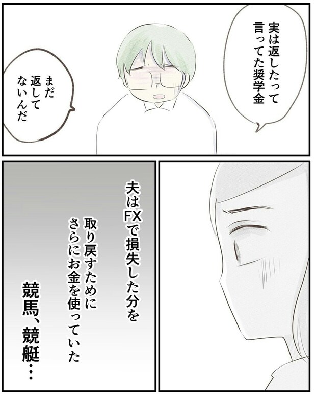 ある日、みつこさんは夫には300万円の借金があることを知ります。しかも夫は、その借金を返済するため、家計から数十万円を引き出し、ギャンブルにつぎ込んでいたのです。「全部負けちゃった」とへらへら笑う夫に嫌気が差し、しばらく実家に身を寄せていた みつこさん。
