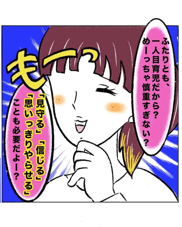 しかし、つーくんママは「ふたりとも、一人目育児だから?めーっちゃ慎重すぎない?『見守る』『信じる』『思いっきりやらせる』ことも必要だよー?」とつーくんを心配するまるさんとまーくんママのことを大げさだと笑いました。