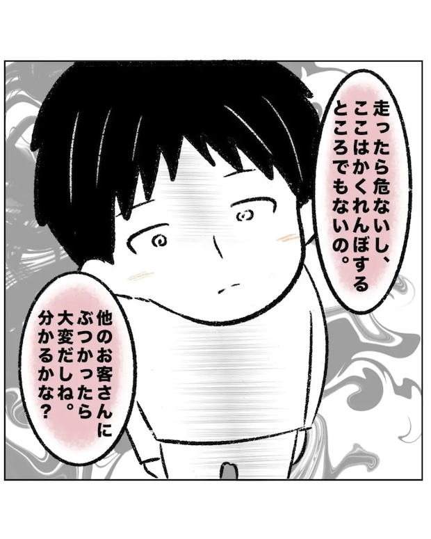 まるさんは黙っていられず「走ったら危ないし、ここはかくれんぼするところでもないの。ほかのお客さんにぶつかったら大変だしね。分かるかな?」とつーくんに話しました。