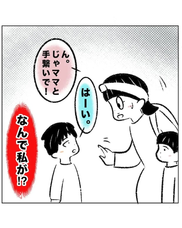つーくんはまるさんの言葉に「はーい」と素直に返事。「ん。じゃママと手繋いで!」とつーくんを促しながらも心の中で「なんで私が!?」と疑問に思うまるさん。