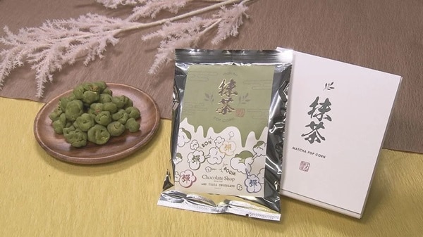 「ポップコーン八女抹茶」は、「チョコレートショップ」の「プレミアムチョコポップコーン」を田辺さんのオリジナルフレーバーでアレンジした一品。八女で130年以上の歴史を持つ吉泉園の抹茶を使用しており、抹茶・ホワイトチョコ・キャラメルのハーモニーを楽しめる。