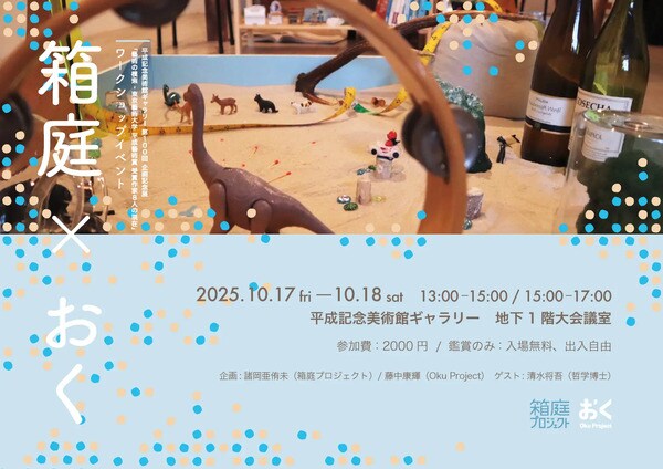 また、「東京藝術大学 平成藝術賞 受賞作家8人の現在『藝術の模索』」期間中の10月17日(金)13:00~15:00・18日(土)15:00~17:00には、 「平成記念美術館 ギャラリー」の地下1F大会議室にて、「箱庭×おく」プロジェクトによるワークショップを開催。参加費は2,000円(要予約)で、鑑賞のみの場合無料・出入自由となっている。