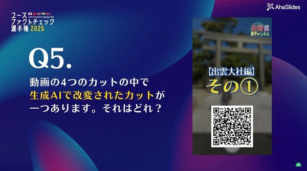 「AI画像検知」の問題は「出雲大社の紹介動画に含まれる、生成AIで作られた架空の神殿を見破れ」。一見本物に見える映像の中から、建築様式の矛盾やAI特有の生成ノイズを見抜き、フェイク映像を特定する審美眼が試された。
