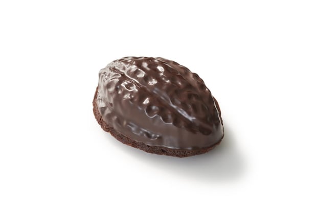 カカオの実の形を模した焼き菓子。エアリーな食感に焼き上げ、ダークチョコレートでコーティングした。