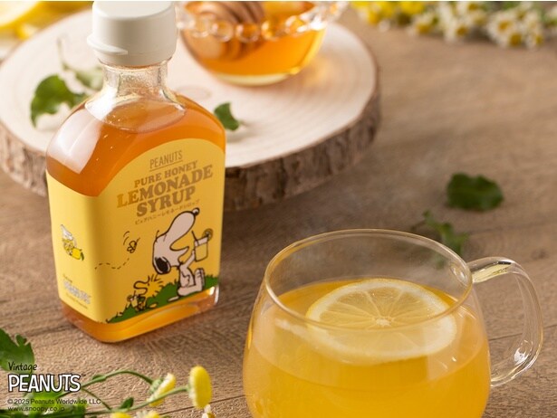 これからの季節はお湯で割ってホットレモネードとして楽しみたい「SNOOPY ピュアハニーレモネードシロップ」(190グラム/1490円)は、広島県産レモン果汁とウクライナ産のひまわりはちみつで作られたレモネードベース。炭酸水で5倍に割ると、自宅で本格レモネードを楽しむことができる。