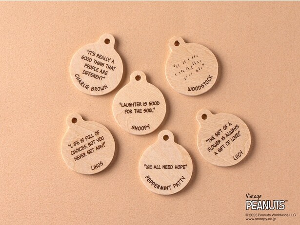 「SNOOPY PURE&NATURAL PRODUCTS」シリーズには、ランダムで6種類のウッドチャームが付属するのも魅力。裏面にキャラクターのセリフがデザインされているので、コンプリートを目指そう。