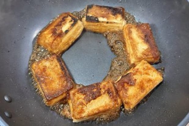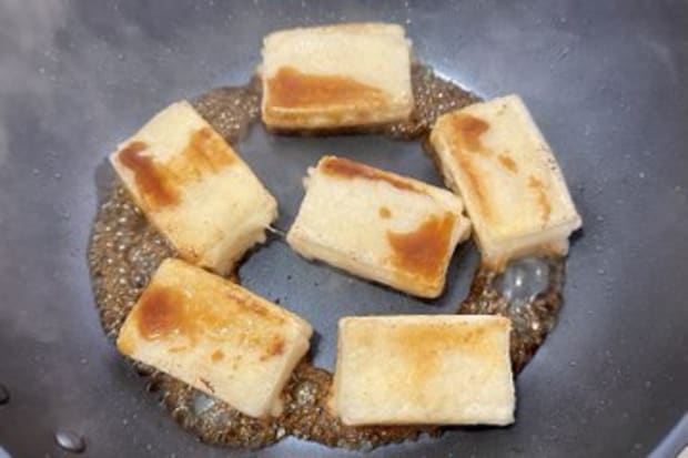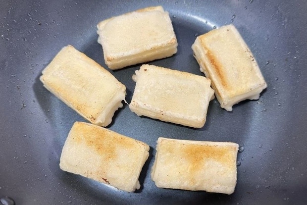 ②の餅の表面を揚げるように焼く