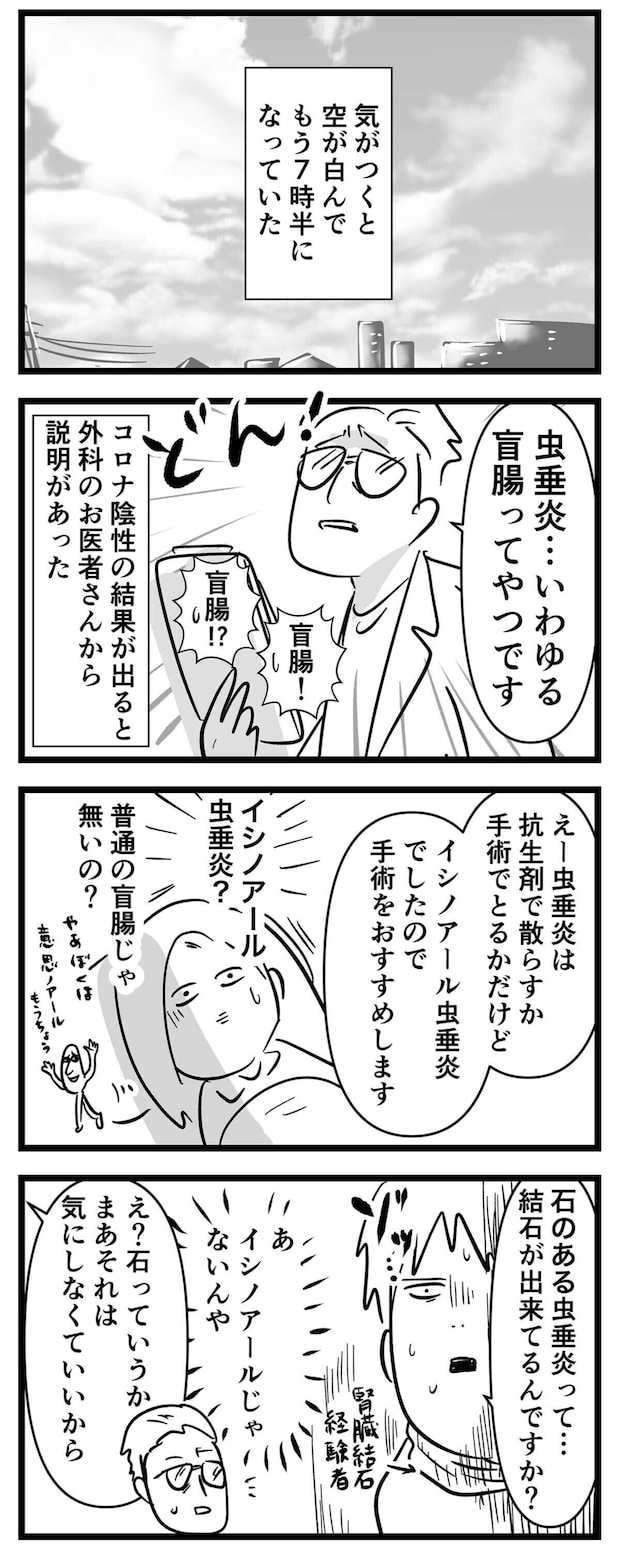 しばらく時間がたって検査結果が出たところ、虫垂炎いわゆる盲腸という結果に。「石のある虫垂炎」ということで、医師から手術を勧められ緊急手術をおこなうことになったのでした。