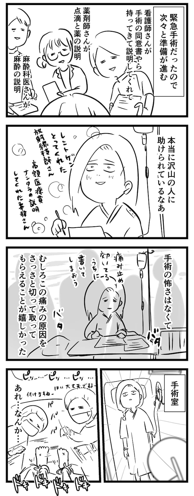 看護師さんや薬剤師さんなどたくさんの人に助けられていることに感謝しつつ、痛みがなくなることがうれしいえむふじんさんは、手術をおこなうことに対して前向きで不思議と怖さはありませんでしたが…。